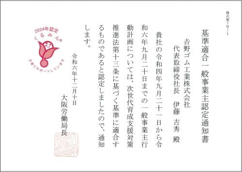 この度、吉野ゴム工業株式会社は、厚生労働省が定める「くるみん」認定制度に基づき、「子育てサポート企業」として、